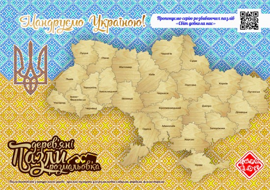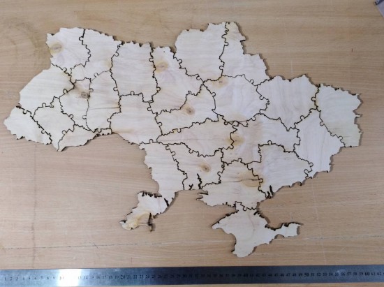 Подарунковий пазл "Карта України". Матеріал фанера 4мм, розмір 700 х 420 мм. В зв'язку з переходом на нову технологію виготовлення, кромки у вироби темно коричневого кольору.