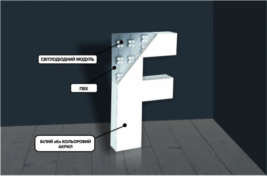 ОБ'ЄМНІ СВІТЛОВІ БУКВИ З ФРОНТАЛЬНИЙ ПІДСВІЧУВАННЯМ